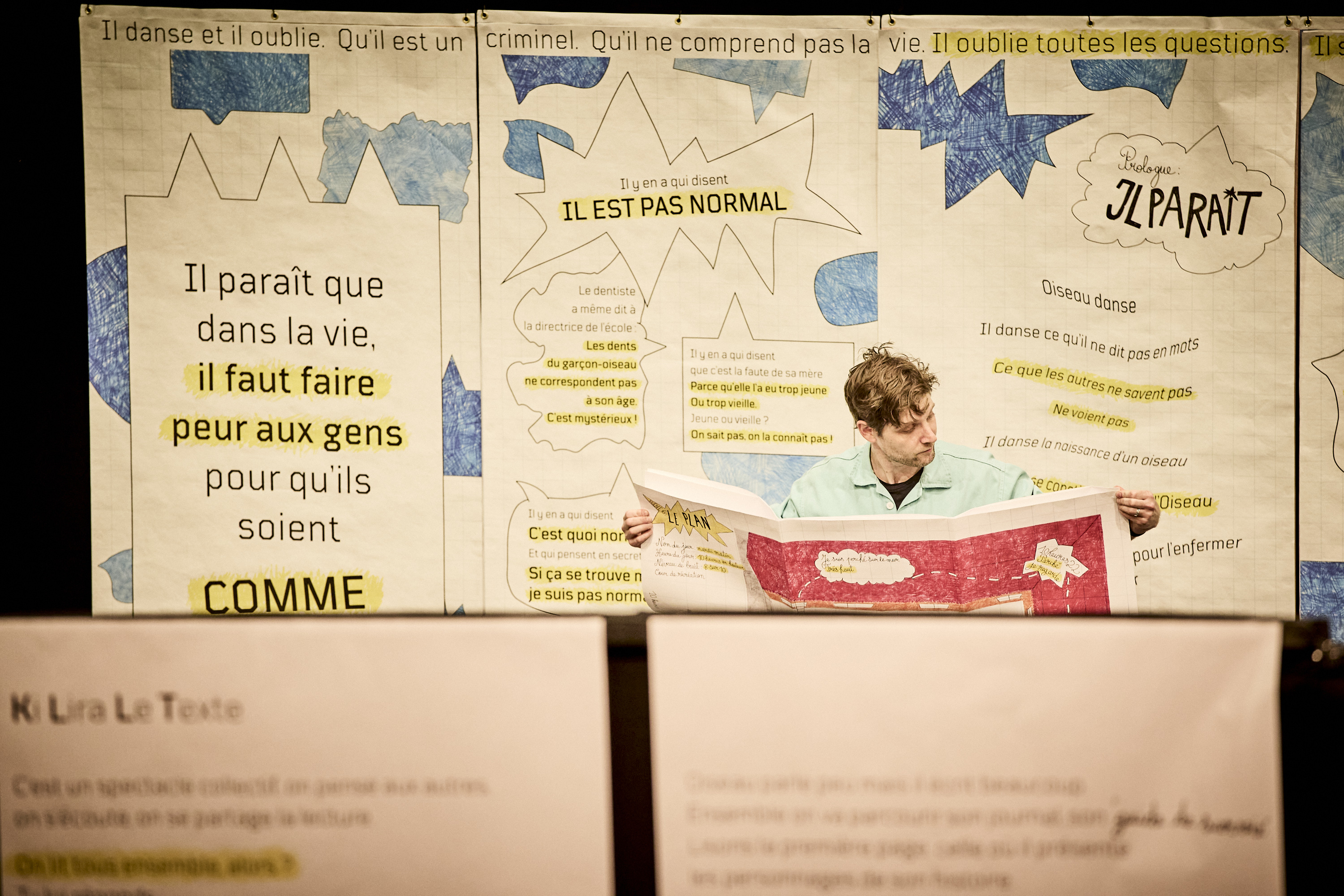 Dans un lieu – un théâtre, un lieu patrimonial, un établissement scolaire, une entreprise – un comédien devient guide pour un petit nombre de participants. Il devient lecteur d’un texte théâtral exposé sur un parcours scénographié et typographié pour être lu collectivement. Le comédien-guide-lecteur se fait enfin passeur, lorsqu’il invite peu à peu chaque participant à prendre part – seul ou en choeur –, à lire et à endosser un rôle, passant du statut de spectateur à l’état de lecteur, acteur de l’expérience, en immersion dans le texte. Les mots se retrouvent partout, sur les murs, une carte, un t-shirt ou dans le creux de la main dans ce parcours théâtral et visuel.