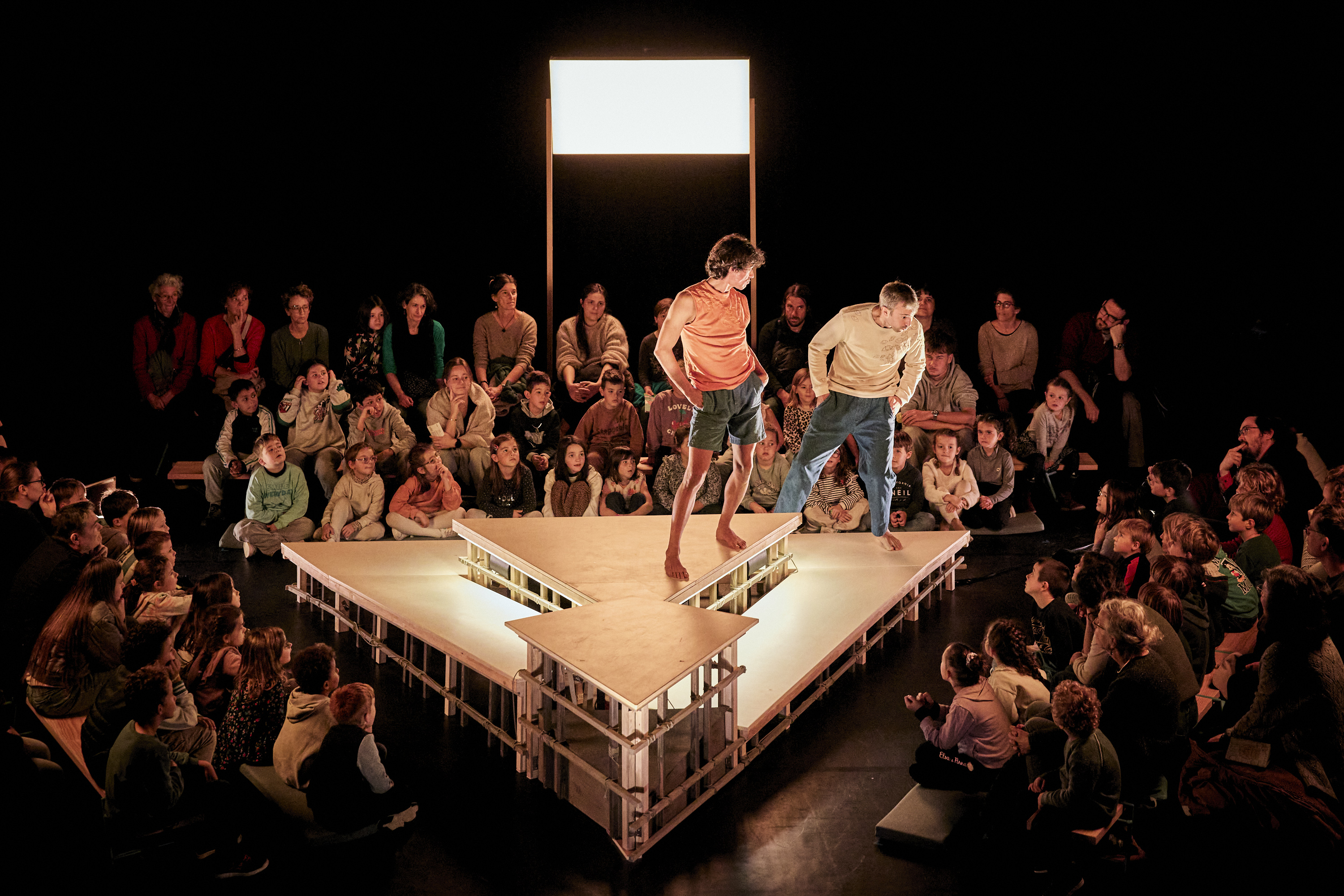Ramener le corps et le mot au centre du récit en mêlant théâtre et cirque pour aller à la rencontre des tout-petits : c’est la démarche entamée en 2020 avec Des pieds et de mains pour les maternelles. Ce projet a donné naissance aux spectacles NATHAN LONGTEMPS et BASTIEN SANS MAIN. C’est également à ce moment-là qu’a débuté la collaboration avec Antonio Carmona auteur qui marie humour et poésie glissant de la sensibilité entre ses lignes. Il parle aux plus jeunes avec délicatesse, sans pour autant simplifier des thématiques complexes comme la maladie, la peur de l’abandon, la différence ou encore la jalousie, comme en témoigne MATHIEU AU MILIEU. Cette pièce traite de la jalousie fraternelle, mais évoque aussi, en filigrane, la peur de l’autre.